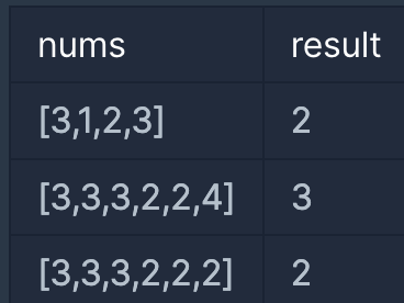 당신은 폰켓몬을 잡기 위한 오랜 여행 끝에, 홍 박사님의 연구실에 도착했습니다. 홍 박사님은 당신에게 자신의 연구실에 있는 총 N 마리의 폰켓몬 중에서 N/2마리를 가져가도 좋다고 했습니다. 홍 박사님 연구실의 폰켓몬은 종류에 따라 번호를 붙여 구분합니다. 따라서 같은 종류의 폰켓몬은 같은 번호를 가지고 있습니다. 예를 들어 연구실에 총 4마리의 폰켓몬이 있고, 각 폰켓몬의 종류 번호가 [3번, 1번, 2번, 3번]이라면 이는 3번 폰켓몬 두 마리, 1번 폰켓몬 한 마리, 2번 폰켓몬 한 마리가 있음을 나타냅니다. 이때, 4마리의 폰켓몬 중 2마리를 고르는 방법은 다음과 같이 6가지가 있습니다. 첫 번째(3번), 두 번째(1번) 폰켓몬을 선택 첫 번째(3번), 세 번째(2번) 폰켓몬을 선택 첫 번째(3번), 네 번째(3번) 폰켓몬을 선택 두 번째(1번), 세 번째(2번) 폰켓몬을 선택 두 번째(1번), 네 번째(3번) 폰켓몬을 선택 세 번째(2번), 네 번째(3번) 폰켓몬을 선택 이때, 첫 번째(3번) 폰켓몬과 네 번째(3번) 폰켓몬을 선택하는 방법은 한 종류(3번 폰켓몬 두 마리)의 폰켓몬만 가질 수 있지만, 다른 방법들은 모두 두 종류의 폰켓몬을 가질 수 있습니다. 따라서 위 예시에서 가질 수 있는 폰켓몬 종류 수의 최댓값은 2가 됩니다. 당신은 최대한 다양한 종류의 폰켓몬을 가지길 원하기 때문에, 최대한 많은 종류의 폰켓몬을 포함해서 N/2마리를 선택하려 합니다. N마리 폰켓몬의 종류 번호가 담긴 배열 nums가 매개변수로 주어질 때, N/2마리의 폰켓몬을 선택하는 방법 중, 가장 많은 종류의 폰켓몬을 선택하는 방법을 찾아, 그때의 폰켓몬 종류 번호의 개수를 return 하도록 solution 함수를 완성해주세요.